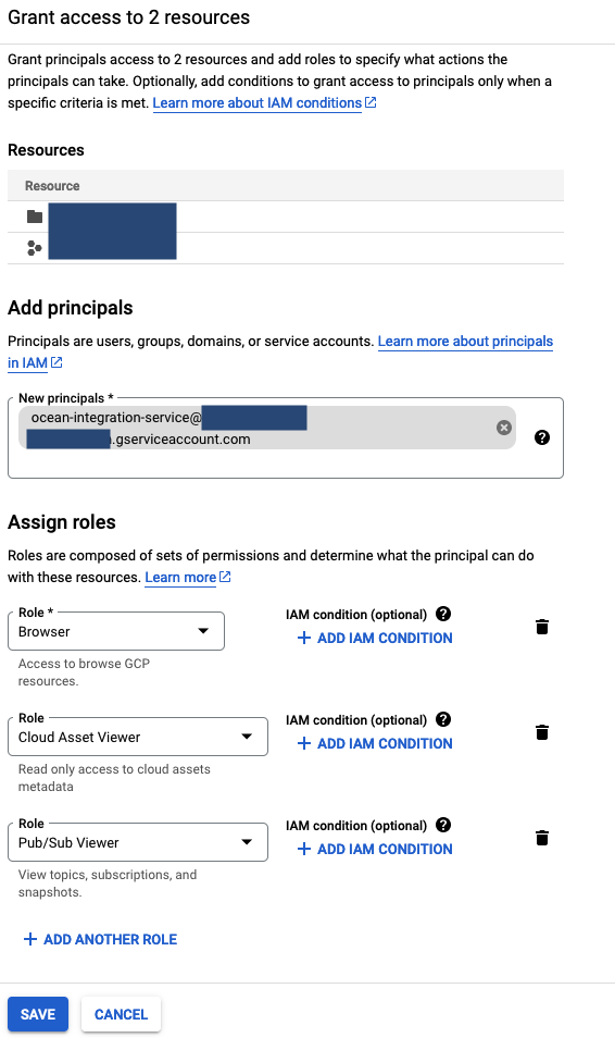 ocean_service_account_custom_roles | [] | False | A list of custom roles you want to grant the Integration's Service account. The module will grant these permissions to every available project and to the setup project gcp_ocean_setup_project . Example value: ["organizations/1234567890/roles/MyCustomRole", "organizations/1234567890/roles/MyOtherCustomRole"] |