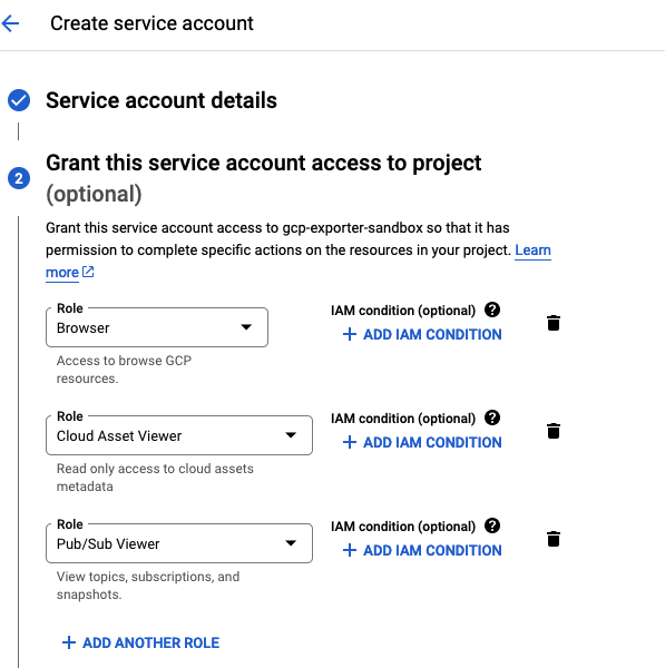 If you want the integration to collect resources from multiple projects/folders or to have it collect from the entire organization, you need to have permissions to create/view additional resources. Follow these instructions to make sure you are equipped with enough permissions.