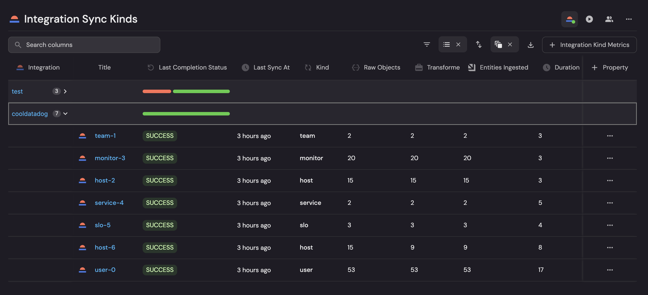 blueprint tracks detailed metrics for specific integration kinds, including raw, transformed, and ingested objects.
