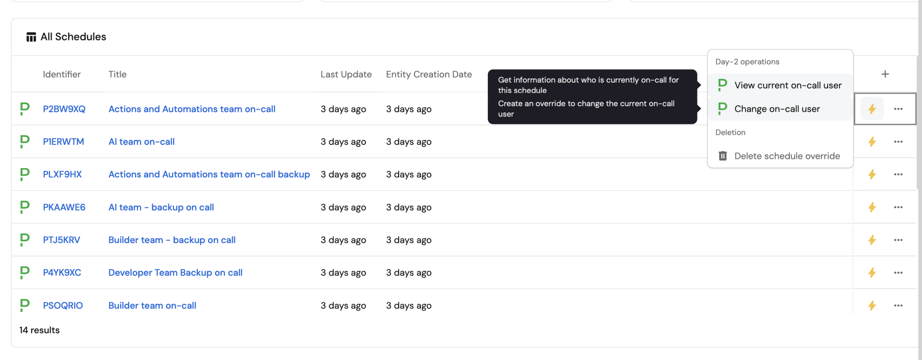 - Set up self-service actions to manage on-call schedules (view schedules, change on-call users, create overrides).